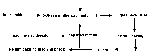 本系列設(shè)備主要用于聚脂瓶裝各種礦泉水、純凈水等不含氣飲料的生產(chǎn),在一機(jī)上實(shí)現(xiàn)沖瓶、灌裝、封蓋。